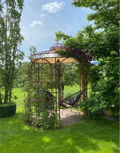 Geht die Begrünung über die Gebäudefassade hinaus, bildet ein stabiler Rosenbogen die Brücke zwischen Gebäude und Garten. Stilvoll platziert und mit einem passenden Rankgitter aus Metall kombiniert, ergibt sich ein perfektes Design.