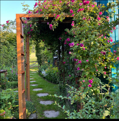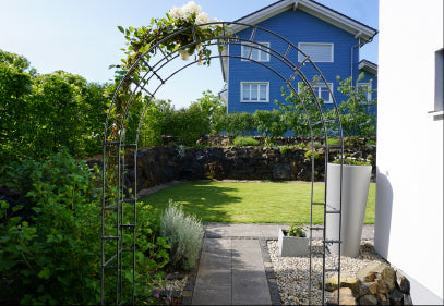 Nicht nur in romantisch angelegten Gärten lassen sich Rosenbögen eindrucksvoll integrieren. Auch im naturbelassenen Garten berankt mit Rosen oder im modernen Garten geziert mit immergrünem Efeu ist ein Rosenbogen ein toller Blickfang. Ob als Trennelement oder einladender Eingang - Rosenbögen passen in jeden Garten.