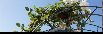 Rosenbögen aus Metall zählen zu den beliebtesten und dekorativsten Rankhilfen. Vor allem als Grundstückseingang sind Rosenbögen ein einladendes und optisches Highlight. Üppig blühende Kletterrosen gehören zwar zu den Pflanzen, an die man zuerst bei ihrer Bepflanzung denkt - aber auch Rank- und Kletterpflanzen wie eine violett-rosa blühende Clematis, immergrüner Efeu oder wilder Wein, an dem saftige Trauben wachsen, setzen Rosenbögen prachtvoll in Szene.