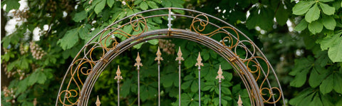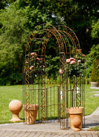 Als Garteneingang bietet sich insbesondere ein Eisen-Rosenbogen mit Tor an – so wie unser Rosenbogen "Calabria", der formschön und praktisch zugleich ist. Mit seinem romantischen, opulenten Design und passender Tür ist er die Krönung für Ihren Garten.