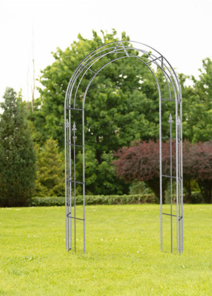 silbrig-matter Farbe verleiht dem Rosenbogen eine elegante und zeitlose Optik, die gut mit verschiedenen Gartenstilen harmoniert.